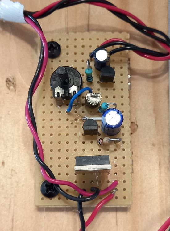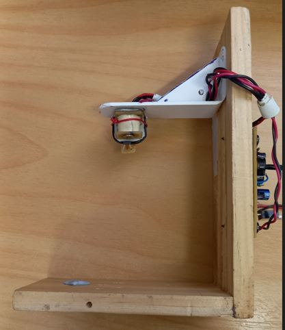 Electromagnet, Hall Sensor and Control circuit Mounted on a piece of wood to hold them vertically.