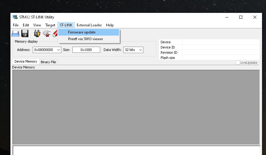 From top menu, Select: ST-Link -> Firmware Upgrade