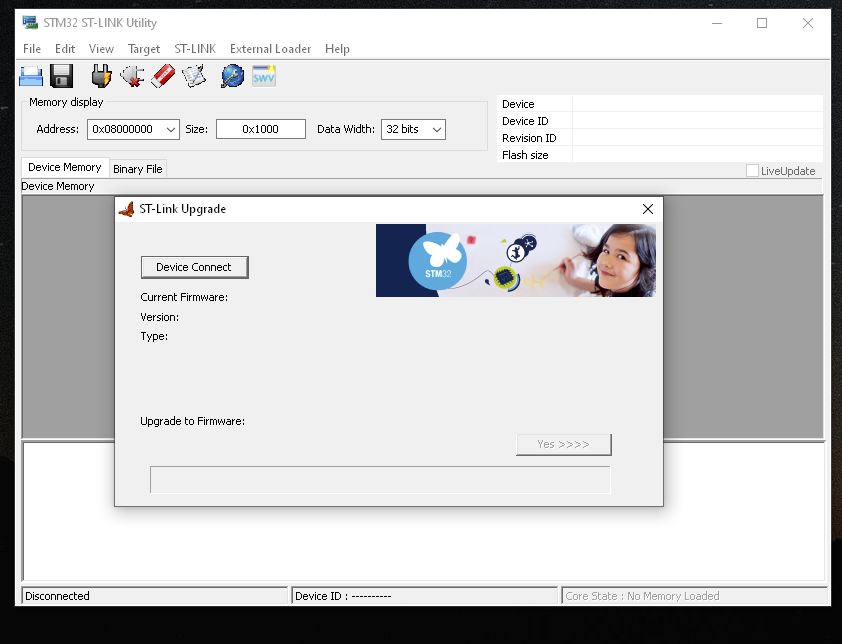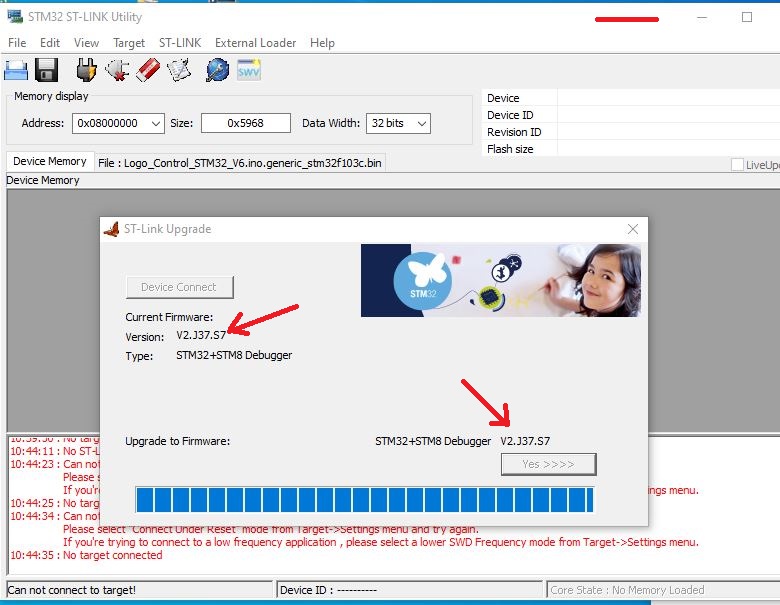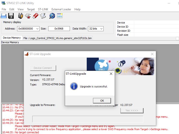 If there is an error message, re insert the ST-Link Programmer to the USB Port.