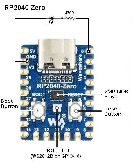 This example we used RP2040 Zero with an external LED +Current Limiting Resistor on GPIO-0.