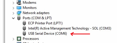 Use the device manager on your PC to get the Comport number, in our case COM6 as seen below