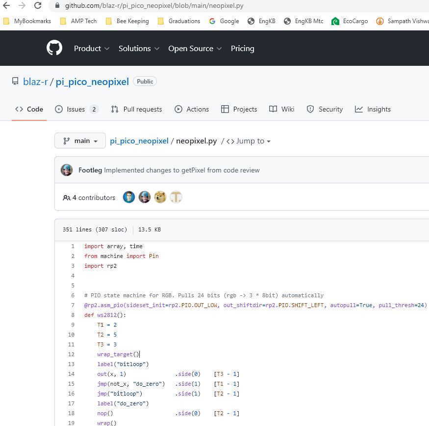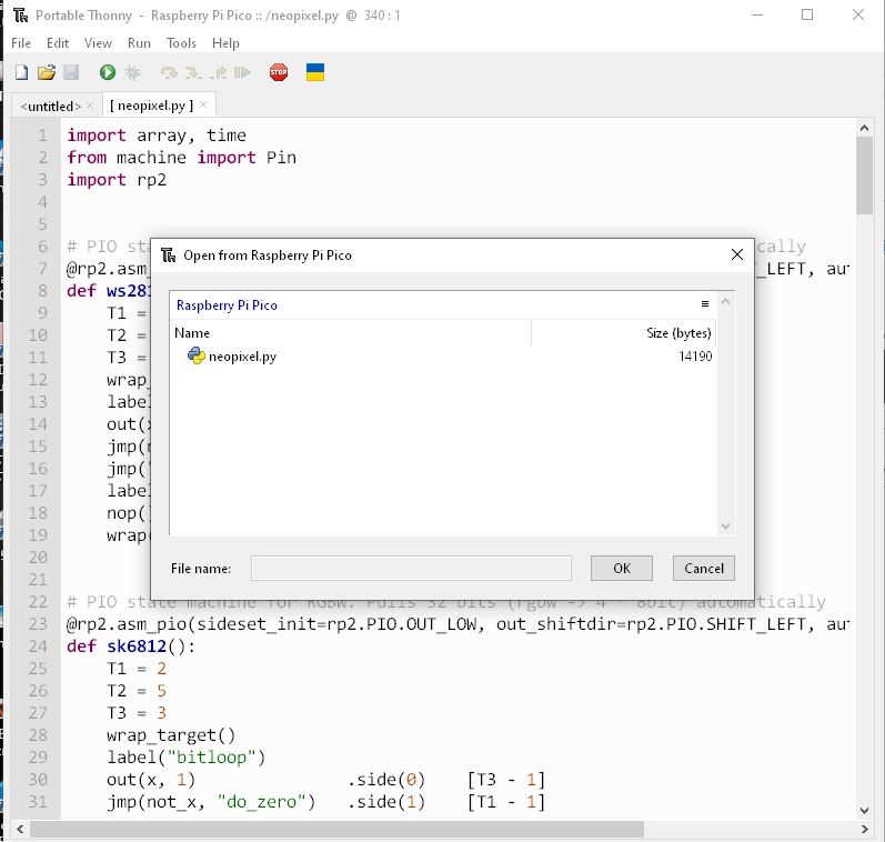 Open a new document in Thonny, copy and past the MicrPython script called neopixel.py from this link
